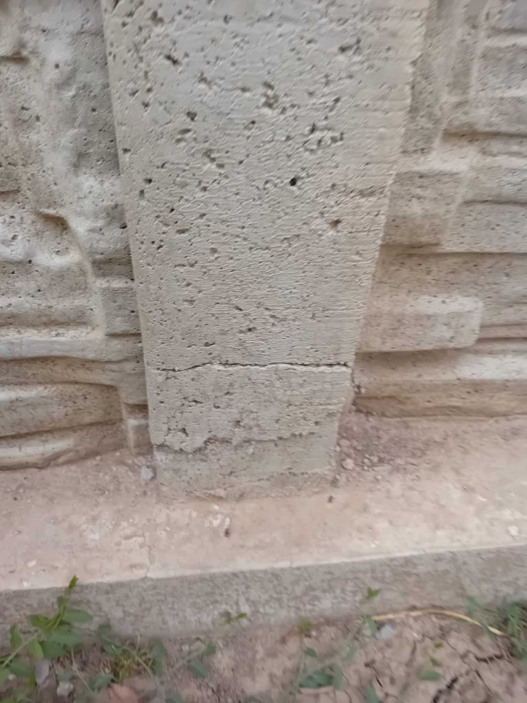 Această imagine arată un gard de beton care prezintă fisuri semnificative. Fisurile au apărut din cauza unui amestec de beton de calitate inferioară și a unei turnări incorecte. În timpul unui cutremur, acest gard ar putea să cedeze complet, punând în pericol zona înconjurătoare.